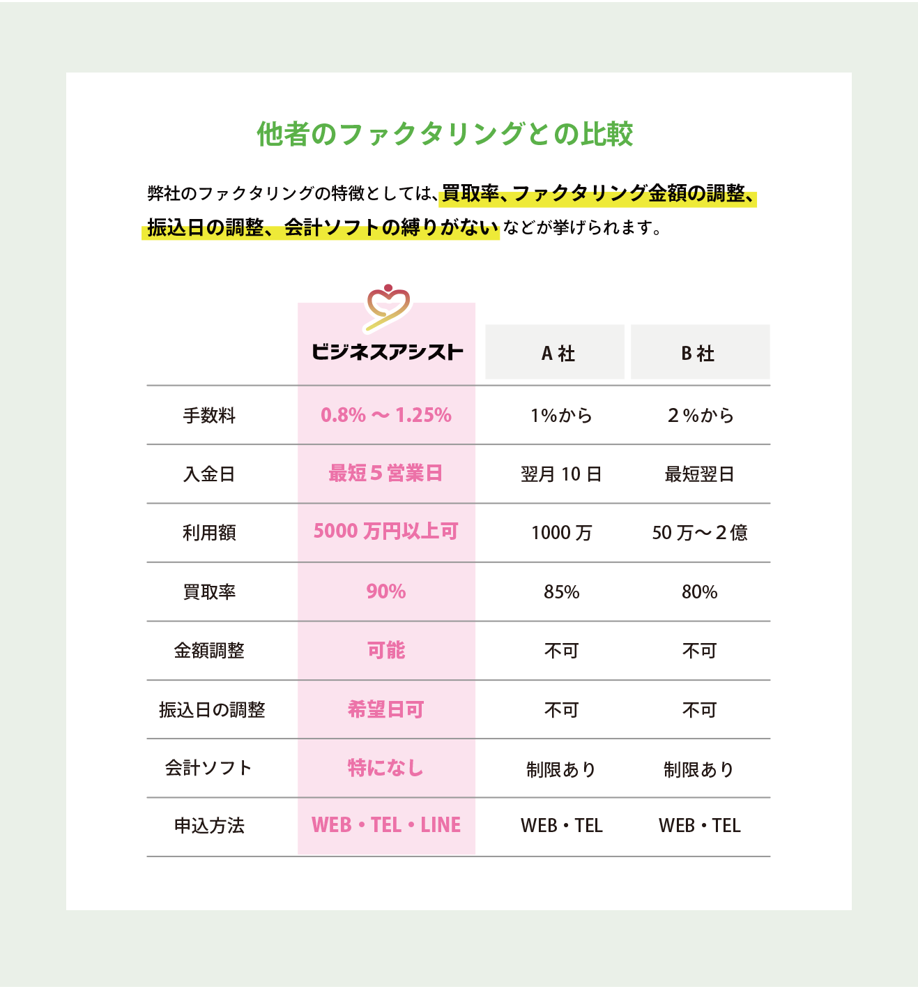 | 買取率 | 請求額の90% (初回は請求額の2.5ヶ月分実行可能) |