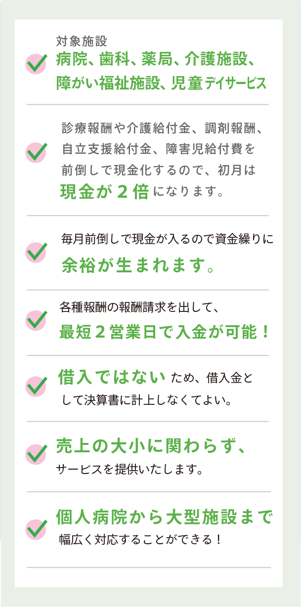 | 対象債権 | 診療報酬・介護給付金・調剤報酬・自立支援給付金・障害児給付費 |